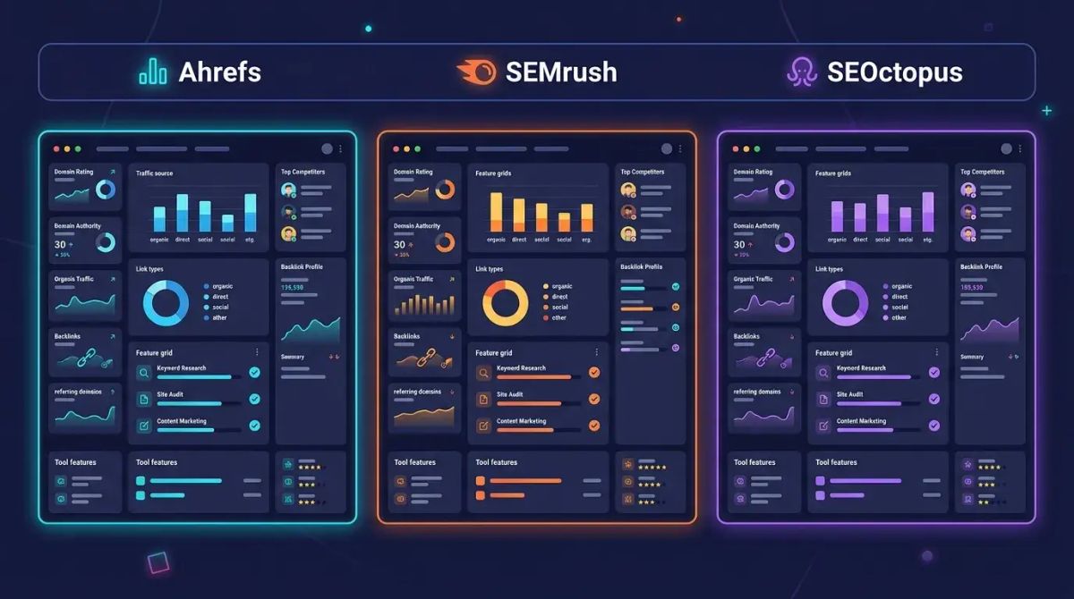 These tools combine keyword research, backlink analysis, rank tracking, site auditing, and competitor analysis under one roof. Ahrefs, SEMrush, and SEOctopus are leading examples in this category.
