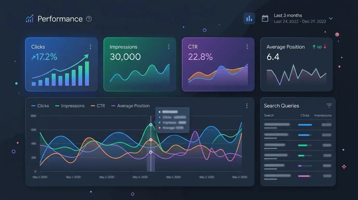 The Performance report is the most frequently used and most valuable section of GSC. It shows your site's performance in Google Search results through four core metrics.