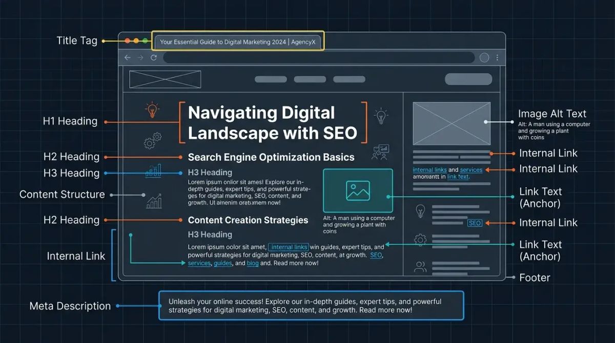 On-page SEO covers all optimizations made directly on your web pages: title tags, meta descriptions, content quality, header tags, image optimization, internal linking, and page speed. Off-page SEO focuses on external signals: backlinks, social media mentions, brand searches, and third-party references. Both are essential for ranking success, but on-page SEO is the area entirely within your direct control, making it the logical starting point for any optimization effort.